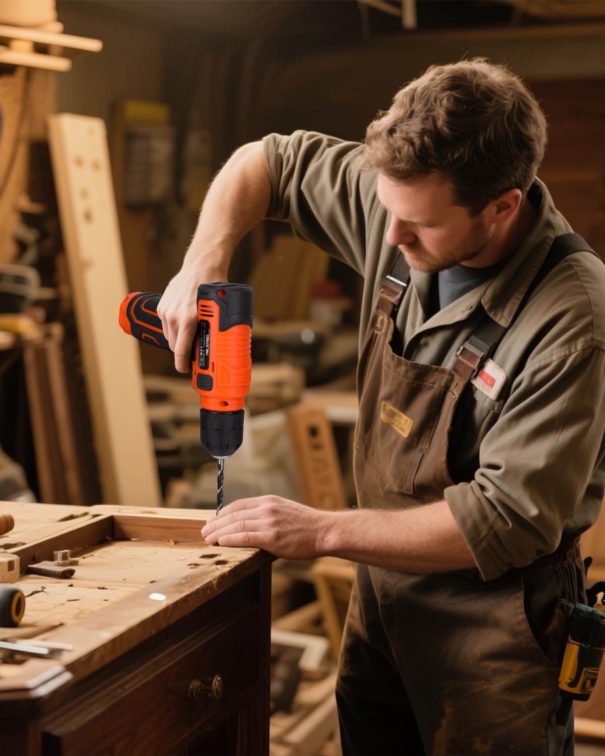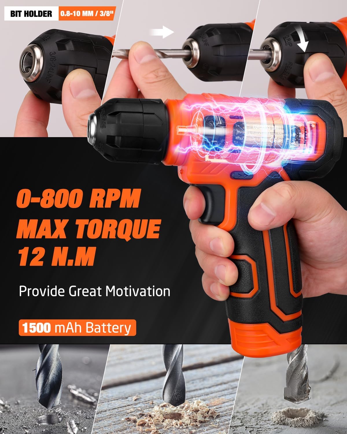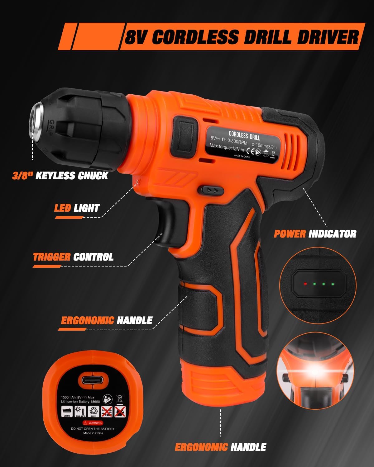 • 8V Power Cordless Drill with LED: Ergonomically designed with a non-slip grip, this lightweight drill offers adjustable speed up to 800 RPM and features an integrated LED light for visibility in dim conditions.